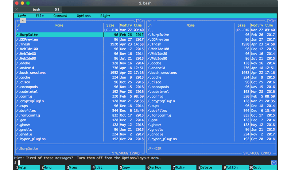 Midnight Commander is yet still popular terminal file manager. It has classical 2-panes design, and you can send it to background